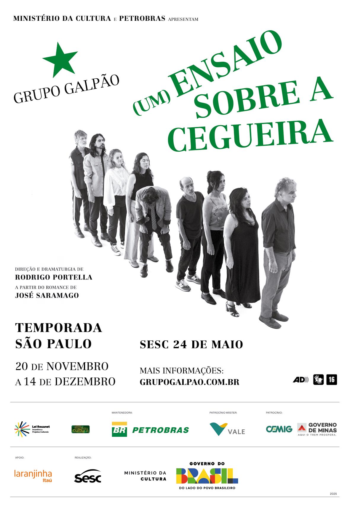 Galpão e a obra de José Saramago, escritor português ganhador do Prêmio Nobel de Literatura. O espetáculo também conta com o “Ingresso Experiência”, categoria na qual o público poderá vivenciar vedadas a peça nesta experiência imersiva e sensorial no palco, guiada pelo elenco. Com: Grupo Galpão. Dramaturgia e direção: Rodrigo Portella. Elenco: Antonio Edson, Eduardo Moreira, Fernanda Vianna, Inês Peixoto, Júlio Maciel, Luiz Rocha, Lydia Del Picchia, Paulo André e Simone Ordones. Direção musical, trilha original e paisagem sonora: Federico Puppi. Interlocução Dramatúrgica: Bianca Ramoneda. Sesc 24 de Maio / Teatro - R. 24 de Maio, 109. República. T. 3350.6300. Quinta a sábado, 19h; domingo e feriado, 18h. R$70. 140min. 16 anos. Até 14/12.