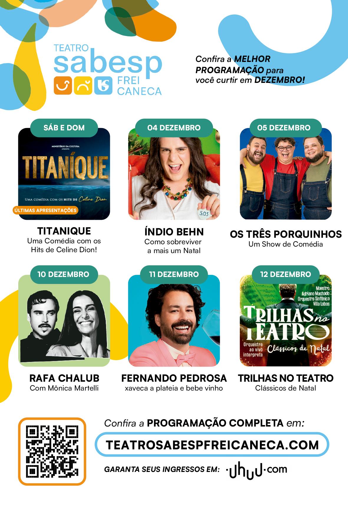 Comédia do clássico Titanic, repleto de reviravoltas absurdas e canções icônicas. O espetáculo é uma carta de amor à música pop, ao cinema e ao teatro musical. A história de amor de Jack e Rose é reimaginada sob a ótica exagerada e dramática da diva pop Céline Dion, que assume o papel de narradora. Elenco: Alessandra Maestrini, Marcos Veras, Giulia Nadruz, Luis Lobianco, George Sauma, Wendell Bendelack e Talita Real. Direção: Gustavo Barchilon. Teatro Sabesp Frei Caneca / Shopping Frei Caneca - R. Frei Caneca, 569. Consolação. Sábado, 17h e 20h; domingo, 15h e 18h. A partir de R$20. 110min. 12 anos. Até 14/12.
