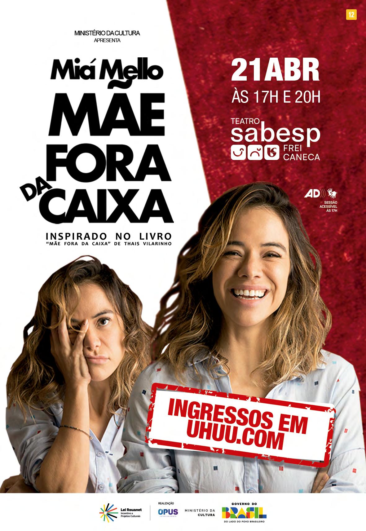 MInspirada no best-seller homônimo de Thaís Vilarinho, a peça trata sobre os dilemas que envolvem a maternidade real. Texto: Cláudia Gomes. Elenco: Miá Mello. Direção: Joana Lebreiro. Teatro Sabesp Frei Caneca / Shopping Frei Caneca - R. Frei Caneca, 569. Consolação. Dia 21/04, 17h e 20h. A partir de R$19,80. 80min. 12 anos.