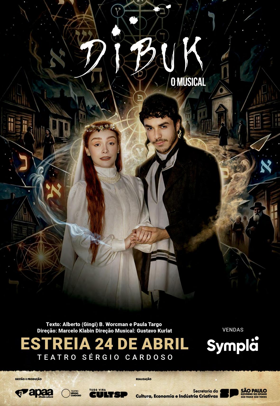 Nova adaptação do texto “O Dibuk”, de Sch. An-Ski, referência do teatro ídiche. A obra apresenta a história de dois jovens ligados por um compromisso anterior ao nascimento. A narrativa aborda elementos da tradição judaica, do folclore e de crenças relacionadas ao dibuk, espírito que, segundo relatos, exige rituais para ser afastado do mundo dos vivos. Texto: Alberto (Gingi) B. Worcman e Paula Targo. Elenco: Veve Goeldi, Luis Vasconcelos, Dagoberto Feliz, Rafael Pucca, Romis Ferreira, Nábia Vilela, Heitor Goldflus, Lilian Blanc, entre outros. Direção: Marcelo Klabin. Direção musical: Gustavo Kurlat. Teatro Sérgio Cardoso - R. Rui Barbosa, 153. Bela Vista. T. 3882.8080. Quinta a sábado, 20h; domingo, 16h. De R$80 a R$300. 150min. 12 anos. Estreia 24/04.