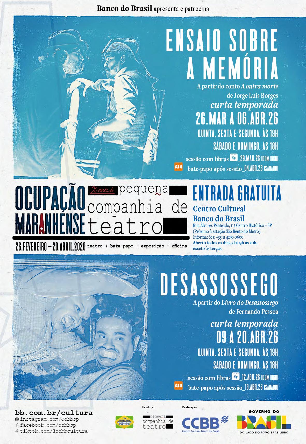 OAté 06/04 - Ensaio Sobre a Memória. Livremente inspirado no conto “A outra morte” de Jorge Luís Borges. Dramaturgia e encenação: Marcelo Flecha. De 09 a 20/04 - Desassossego. Livremente inspirado no “Livro do desassossego” de Fernando Pessoa. Dramaturgia: Marcelo Flecha e Cia. A Máscara de Teatro. Encenação: Marcelo Flecha. Elenco: Luciana Duarte e Jeyzon Leonardo. Centro Cultural Banco do Brasil / Teatro - R. Álvares