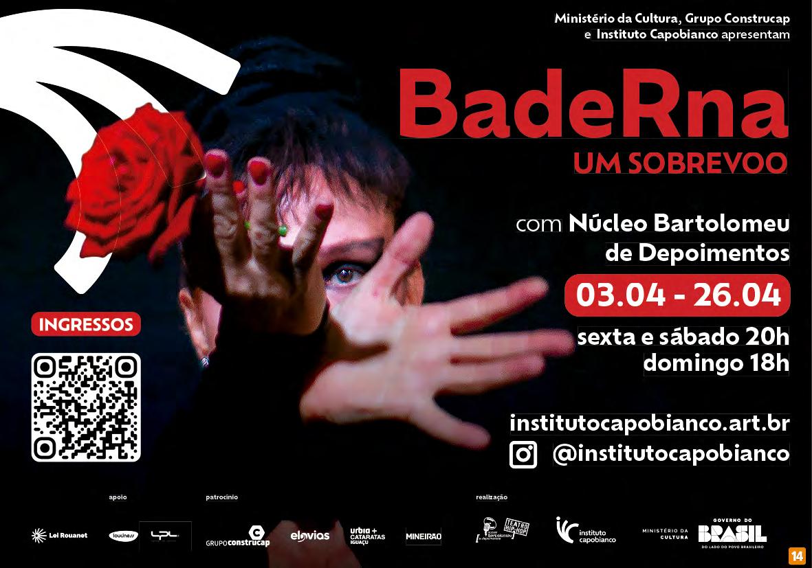 Inspirada na vida e na militância da bailarina italiana Marietta Baderna (1828–1870), a peça parte de sua trajetória como inspiração para uma criação performática que dialoga com seu espírito transgressor. Com: Núcleo Bartolomeu de Depoimentos. Concepção: Luaa Gabanini. Atrizdançarina: Luaa Gabanini. Direção: Roberta Estrela D’Alva. Instituto Capobianco - R. Álvaro de Carvalho, 97. Centro Histórico. T. 3237.1187. Sexta e sábado, 20h; domingo, 18h. R$30. 60min. 14 anos. De 03 a 26/04.