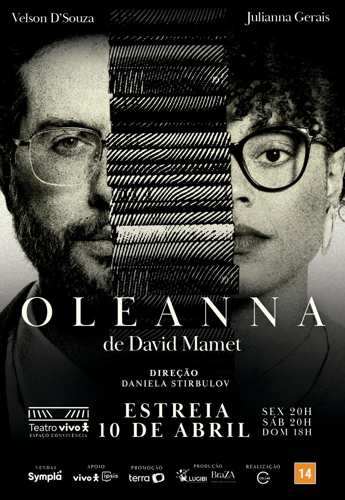 Narra o confronto entre John, um professor universitário no processo de obtenção de uma promoção, e Carol, uma de suas alunas com dificuldades no curso. Texto: David Mamet. Tradução: Velson d’Souza. Elenco: Velson D’Souza e Julianna Gerais. Direção: Daniela Stirbulov. Teatro Vivo - Av. Dr. Chucri Zaidan, 2460. Vila Cordeiro. T.3430.1524. Sexta e sábado, 20h; domingo, 18h. R$100. 70min. 14 anos. Estreia 10/04.