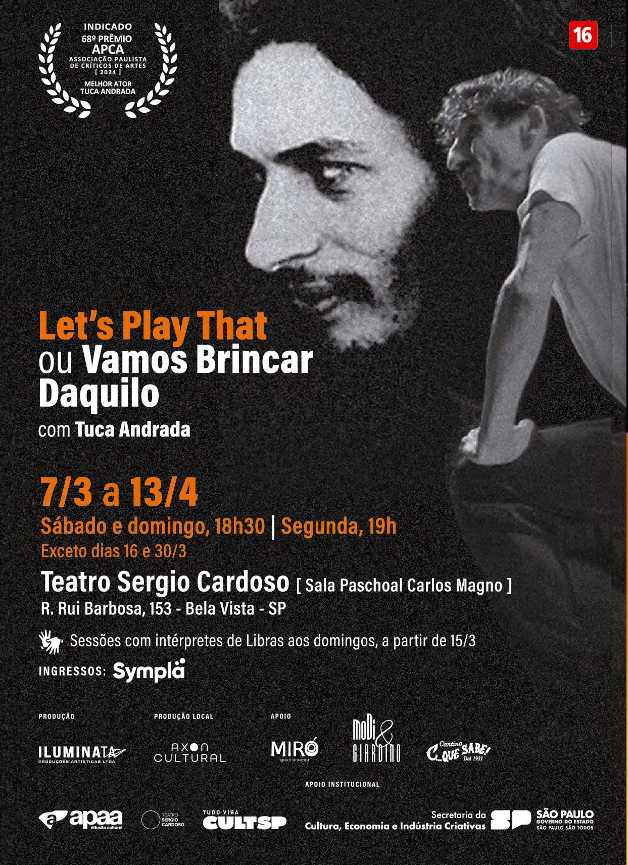 Em formato híbrido de poesia, show, aula-espetáculo e debate, o solo marca o retorno do ator aos palcos e apresenta uma leitura pessoal, política e provocadora sobre Torquato Neto (1944–1972), poeta, jornalista e um dos nomes mais inquietos do Tropicalismo. Criação: Tuca Andrada, a partir da obra e vida de Torquato Neto. Elenco: Tuca Andrada. Direção: Tuca Andrada e Maria Paula Costa Rêgo. Teatro Sérgio Cardoso / Sl. Paschoal Carlos Magno - R. Rui Barbosa, 153. Bela Vista. T. 3882.8080. Sábado e domingo, 18h30; segunda, 19h. R$120. 70min. 16 anos. Até 13/04.