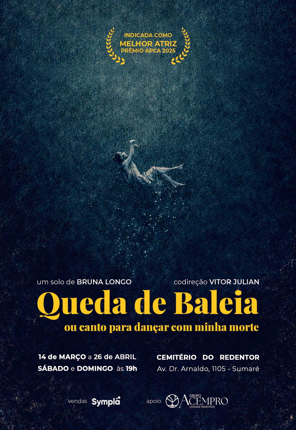 Bruna Longo acaba de morrer e procura elaborar o luto de si mesma – a única coisa que não podemos fazer empiricamente – enquanto reflete sobre a relação humana com a finitude, o tabu da morte na vida cotidiana e o processo de eliminação do rito fúnebre nas sociedades capitalistas ocidentais. Dramaturgia, elenco e direção: Bruna Longo. Codireção: Vitor Julian. Capela do Cemitério do Redentor - Av. Dr. Arnaldo, 1105. Sumaré. Sábado e domingo, 19h. R$60. 80min. 12 anos. Até 26/04.
