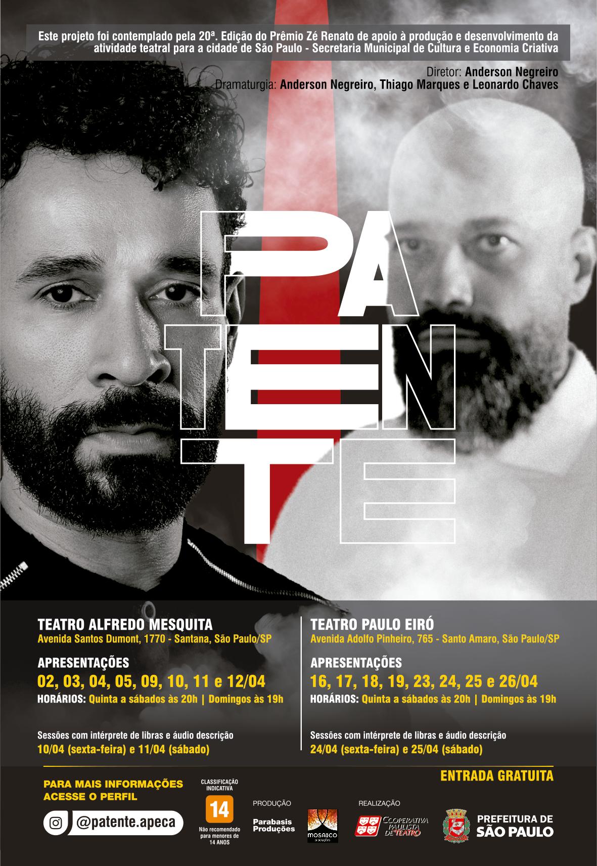A montagem parte de um prelúdio imaginário da tragédia shakespeariana para investigar a branquitude e seus mecanismos de naturalização no Brasil. Dramaturgia: Anderson Negreiro, Thiago Marques e Leonardo Chaves. Elenco: Thiago Marques e Leonardo Chaves. Direção: Anderson Negreiro. Dias 02, 03, 04, 05, 09, 10, 11 e 12/04 - Teatro Alfredo Mesquita - Av. Santos Dumont, 1770. Santana. T. 2221.3657. Dias 16, 17, 18, 19, 23, 24, 25 e 26/04 - Teatro Paulo Eiró - Av. Adolfo Pinheiro, 765. Santo Amaro. T. 5546.0449. Quinta a sábado, 20h; domingo, 19h. Gratuito (retirar ingressos com 1h antes na bilheteria). 70min. 14 anos. Contribuição voluntária Pix: patente. apeca@gmail.com - Banco Santander –Leonardo Chaves Machado.