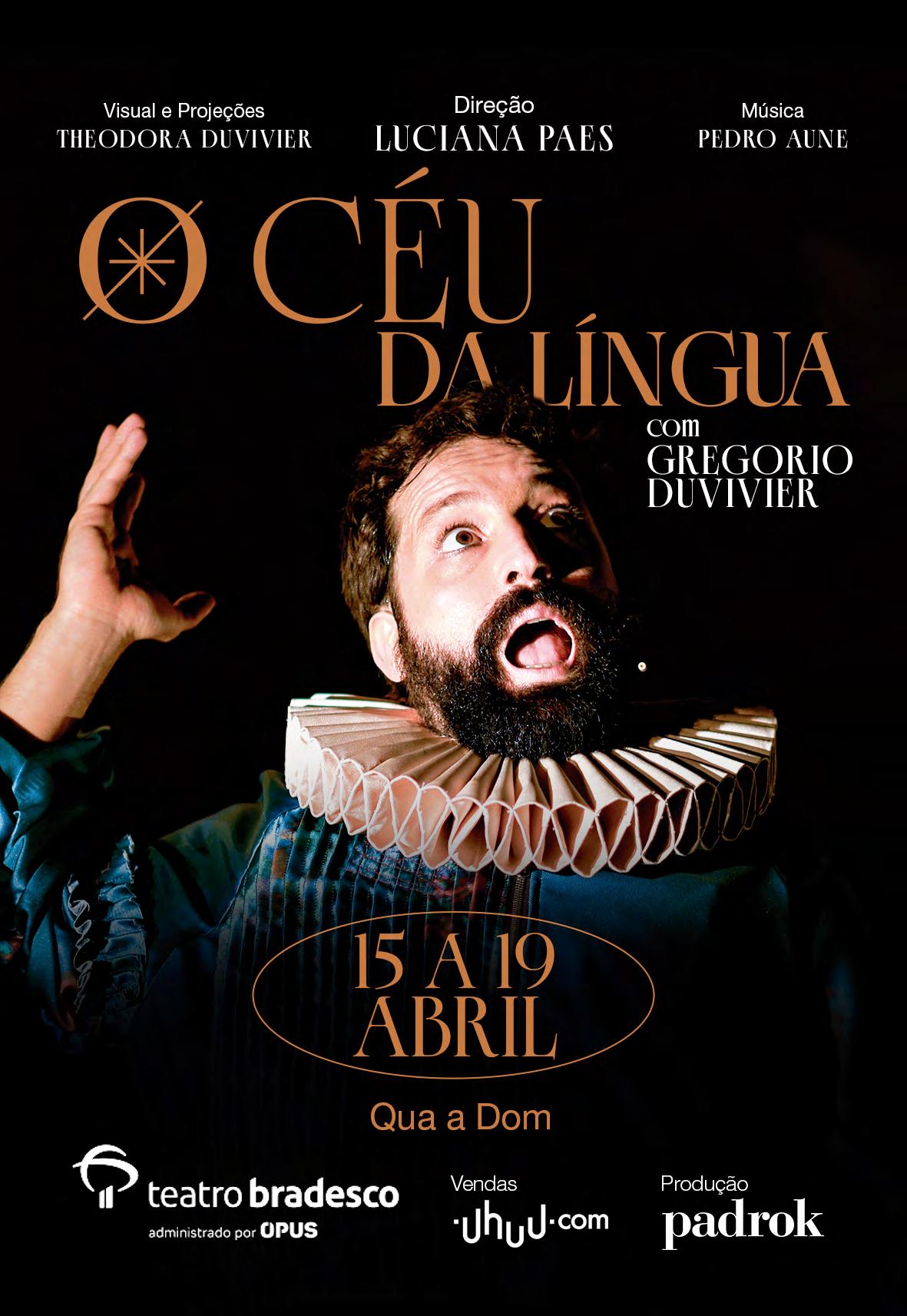 O artista usa o seu discurso sedutor para convencer o público de que tropeçamos diariamente na poesia e o assunto é prazeroso e divertido. Texto: Gregorio Duvivier e Luciana Paes. Elenco: Gregorio Duvivier. Música: Pedro Aune. Direção: Luciana Paes. Teatro Bradesco / Bourbon Shopping - R. Palestra Itália, 500. Perdizes. Dias 15, 16, 17 e 18, 19h e 21h30; 19/04, 16h e 18h30. A partir de R$50. 80min. 12 anos.