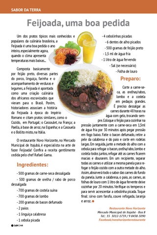 Feijoada, uma boa pedida Um dos pratos típicos mais conhecidos e populares da culinária brasileira, a Feijoada é uma boa pedida o ano inteiro, especialmente agora, quando o clima apresenta temperaturas mais baixas... Composta basicamente por feijão preto, diversas partes do porco, linguiça, farinha e o acompanhamento de verduras e legumes, a Feijoada é apontada como uma criação culinária dos africanos escravizados que vieram para o Brasil. Porém, historiadores associam a história da Feijoada à época do Império Romano e citam pratos similares, como o Cozido, em Portugal; o Cassoulet, na França; a Paella, à base de arroz, na Espanha; e a Casouela e o Bollito misto, na Itália. O restaurante Novo Horizonte, no Mercado Municipal de Itajubá, é especialista na arte de fazer Feijoada! Confira a receita gentilmente cedida pelo chef Rafael Gama.