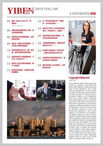 Copyright Statement 免责声明 Unless otherwise stated, Guiding Star Group reserves all copyright in the content and design of this magazine. Guiding Star Group owns all suck copyright or uses it under license or applicable law. You must not link to, publish, or make any commercial or public use of this magazine or its content, except as permitted by statute or with Guiding Star Group prior written consent. Advertising Terms and Conditions must be in writing 48 hours before copy delaine. All editorials or advertisements appearing in Yiben Weekly magazine are subject to copyright, and cannot be reproduced in whole or in part. No views of information contained in articles and advertisement appearing in Yiben weekly magazine are endorsed by the publisher. The publish reserves the right to refuse, withdraw or amend article or advertisements without explanation. Artworks are accepted on condition that publisher cannot guarantee their safe return, the publisher will not be liable for any damage or loss caused by late publication, error of failure of advertisement to appear. Part of contents from Internet may be credited in Yiben weekly magazine under the creative commons deed ( CC BY- SA 3.0). Should there be any object, please contact Guiding Star Group. Appropriate royalties would be made to the verified author in accordance with relevant laws.