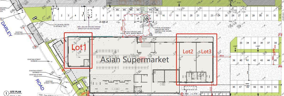LOT1在超市左侧,占地为97.2平方米,紧邻 Darley路,很适合有一定知名度的连锁品牌,或 计划打出知名度的品牌。