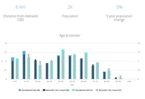 Hazelwood Park的面积约为0.9平方公里。2011年,Hazelwood Park的人口为1,969人。到2016年,人口为 1,863人,在此期间该地区的人口下降率为5.4%。Hazelwood Park的主要年龄组是40-49岁。Hazelwood Park 的家庭主要是有孩子的夫妇,每月可能偿还1400澳元至1799澳元的抵押贷款。一般来说,Hazelwood Park 的人从事专业职业。2011年,Hazelwood Park有76.9%的房屋是自住房屋,而2016年为79.6%。(资料来