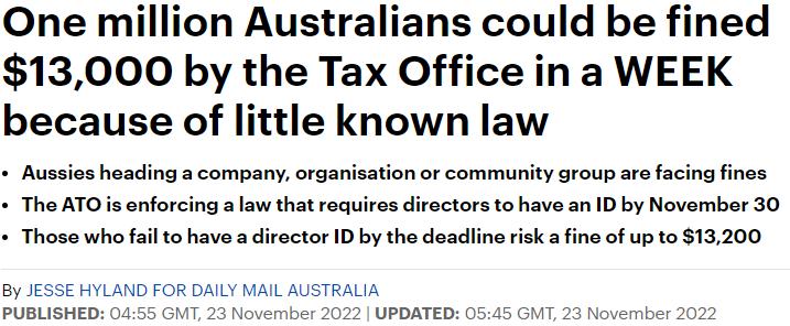 由澳大利亚商业登记处(ABRS)负责。 这包括了经营大型实体、许多小型企业、甚至慈 善机构和非营利组织。未在截止日期前注册的人, 可被处以高达13220澳元的罚款。 根据ATO的一份声明,到目前为止,大约140万 澳人已经申请了15位数字标识符的董事身份号码。 不过,这只不过是全国250万董事中的一部分, 这也就意味着仍有约110万名董事没有申请. 目前,人们可以在几乎不需要证明自己真实身份 的情况下注册成为一家实体公司的董事。 那些与公司日常运营几乎没有任何关系的人被正 式任命为董事,包括背包客、亲戚、甚至是无家 可归者。 如果公司倒闭并被发现违法,这些真实的人可能 会面临法律后果,包括罚款和承担破产责任。 这也使得清算人很难调查破产实体的真实交易及 其商业关系。 《每日邮报》报道称,随着截止日期的临近,董 事的注册数量也在不断增加。仅在周一就有高达 28426名董事提出申请。 澳洲商业注册服务部门(Australian Business Registry Services)副注册官Karen Foat提醒 董事立即注册,不要错过下周的最后期限。 有些人可能实际上没有意识到他们是公司的董事。 即使不穿西装或不在写字楼办公也可能是董事。 “如果你经营一家小企业,自己交养老金,管理 非营利组织,或者经营一家大型体育俱乐部,那 么你就可能是董事,这意味着你需要注册董事身 份证。” 注册董事身份证明是免费的,只需要提供本人的 身份证明即可。 你可以在澳洲商业注册服务网站上申请董事身份 号码。
