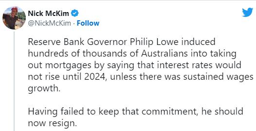 现在!!” 与此同时,包括Craig Kelly和Nick McKim在 内的政客也呼吁Lowe下台。McKim在接受澳洲 新闻集团采访时表示,Lowe的道歉诚意不足,也 太迟了。 “尽管Lowe的道歉是正确的,但要重建澳联储 的信誉还需要做更多工作。毫无疑问,Lowe必须 离开。”