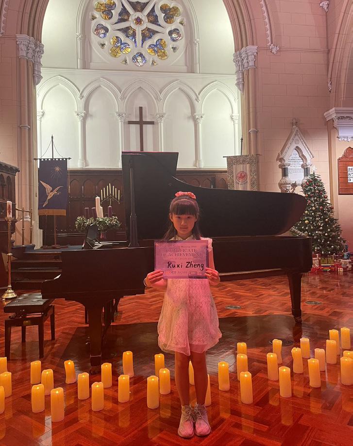 其实,MACA文化宫一直希望孩子们能够发自内 心的热爱乐器演奏,保持自己的个性,让自己的 灵魂与音乐融和。与此同时,MACA文化宫也希 望孩子们明白乐器与演唱是分不开的,无论是爱 弹钢琴的孩子还是爱拉提琴的孩子,都可以爱上 自己的声音,真心欣赏自己全部。 接下来,Ashely Zhang演奏了一曲《The Pink Panther》,粉红豹仿佛跳进了大家的脑海中, 可爱极了;紧接着Orlando Jin 和Claire Jin这对 兄妹带来一曲默契的四手联弹——《Mimacs a la Gare》,欢快的节奏从这对兄妹的手中生发, 洋溢在音乐会的每个角落;Rachel Gong演奏的 《Harmony of the Angel》则属于另一个风格, 温暖而治愈;在James Zhou的《The Changing Seasons》的音乐声中,四季更替流转,让人忍不 住闭上眼全身心沉浸在美妙的乐曲中。 在学琴路上,有趣味相投的朋友是一件幸事,有 年龄相近的兄弟姐妹一起练琴更是幸运非常。那