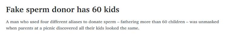 据《每日电讯报》2月18日报道,澳洲一名男子 使用四个不同的化名进行捐精,成为了60多个孩 子的父亲。当这些孩子的家长们参加一次野餐聚 会,无意中发现他们的孩子大多长得一模一样时, 该男子的真面目才被戳穿。