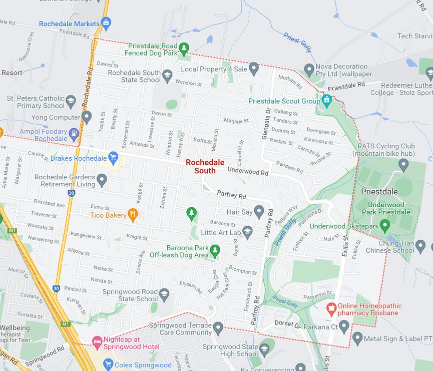 Rochedale South区附近有橄榄球俱乐部、滑板公 园、医院、宠物用品店等。