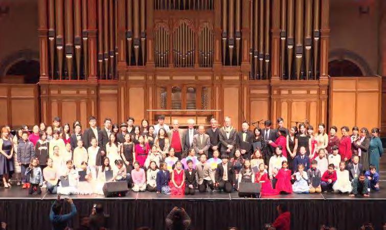 伴随着晚会的进程,第三届“辛笛杯”应用钢琴国际大赛总 决赛各组别的奖项也相继揭晓。评审团主席辛笛教授,云南 师范大学音乐舞蹈学院副院长王文军教授,阿德莱德交响乐 团首席执行官Vincent Ciccarello先生,南澳音乐教师协会主 席,原阿德莱德大学长老音乐学院院长Rodney Smith先生, 澳洲著名作曲家,阿德莱德大学长老音乐学院副院长Stephen Whittington先生共同为获奖者颁发了奖状,奖杯与奖牌。时任 阿德莱德市长马丁赫斯(Martin Haese)先生与前市长黄国鑫先 生为远道而来的辛笛教授及讲师团优秀讲师分别颁发了“中澳 音乐家”,“SAIMAF音乐大使”的殊荣。