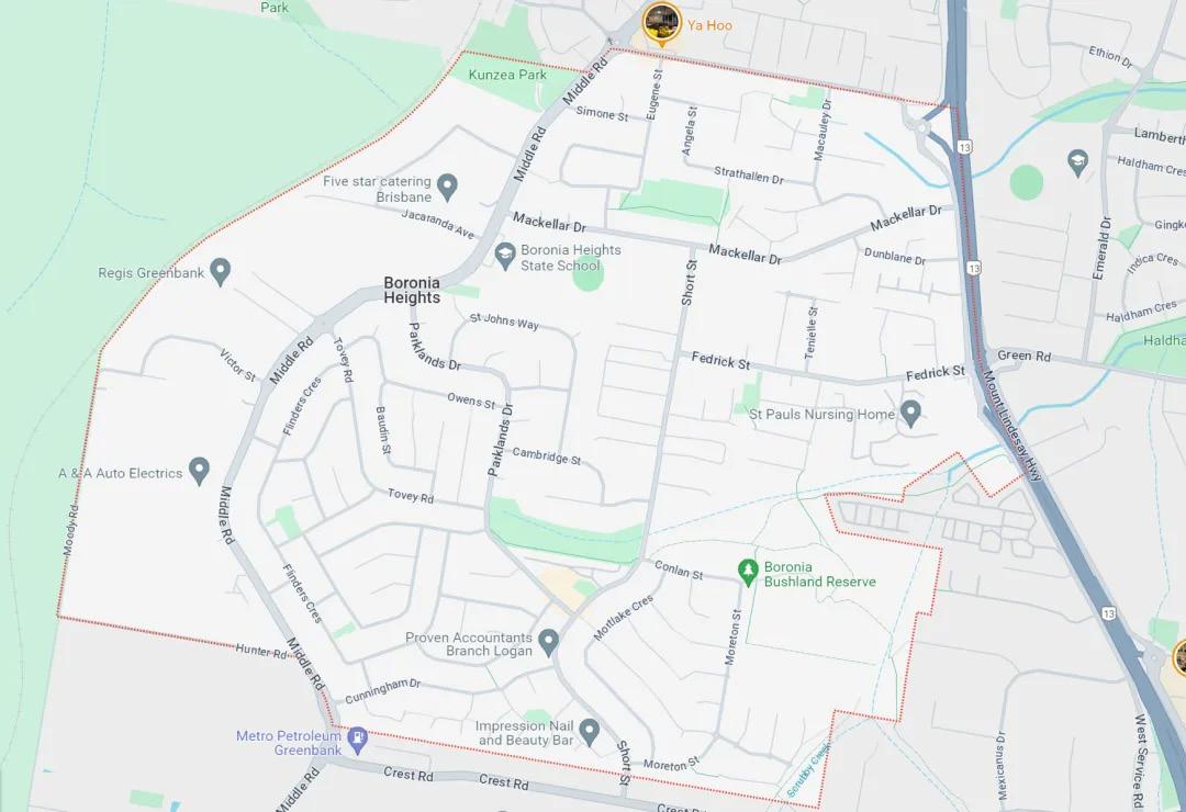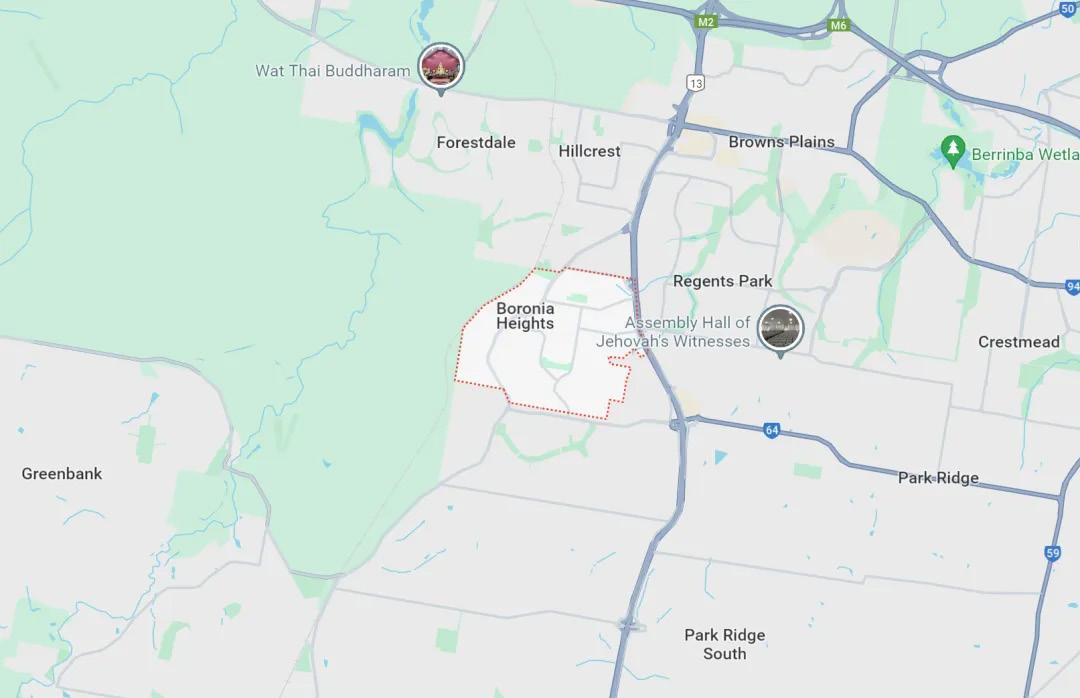 直到 19 世纪 90 年代初,Boronia Heights 一直被称为 Logan Ridges。Boronia Heights公立学校于 1990 年 1 月 29 日开学。1991 年 10 月,Boronia Heights 被列为郊区,并以该地区第一个住宅区命名。Boronia Heights的西部紧邻Greenbank ,南部面向Park Ridge,东部紧邻Regents Park,北部面向Hliicrest。此区归 Brisbane Council管辖。