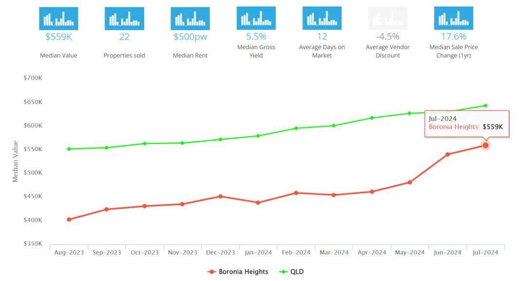在过去的12个月里,Boronia Heights已经卖出了22套独栋房屋,售价中位数为$559K,同比增长17.6%, 平均需要12天即可售出,房东减价为-4.5%。