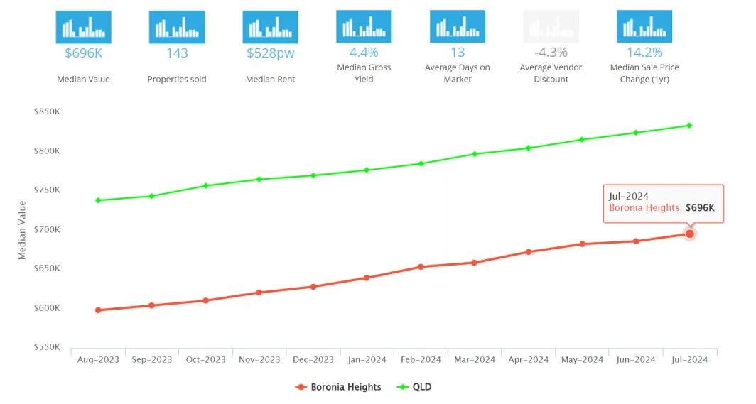 在过去的12个月里,Boronia Heights已经卖出了143套独栋房屋,售价中位数为$696K,同比增长14.2%, 平均需要13天即可售出,房东减价为-4.3%。