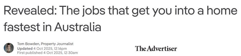 至于那些可能会让你无法进入职场的工作—— 比如创意艺术专业的毕业生,他们的起薪仅为 53768 澳元,而他们又想在阿德莱德购置房产, 那么他们就得攒钱长达 39 年才行。招牌制作师、 油漆工和玻璃工进入该行业的门槛年龄提前了一 年,降至 38 岁,而通信专业的毕业生需要储蓄 35 年的时间。
