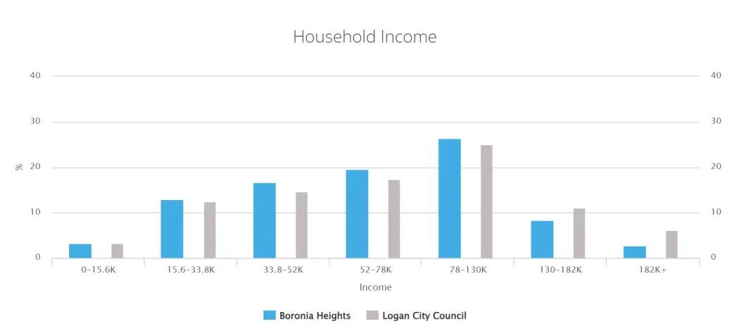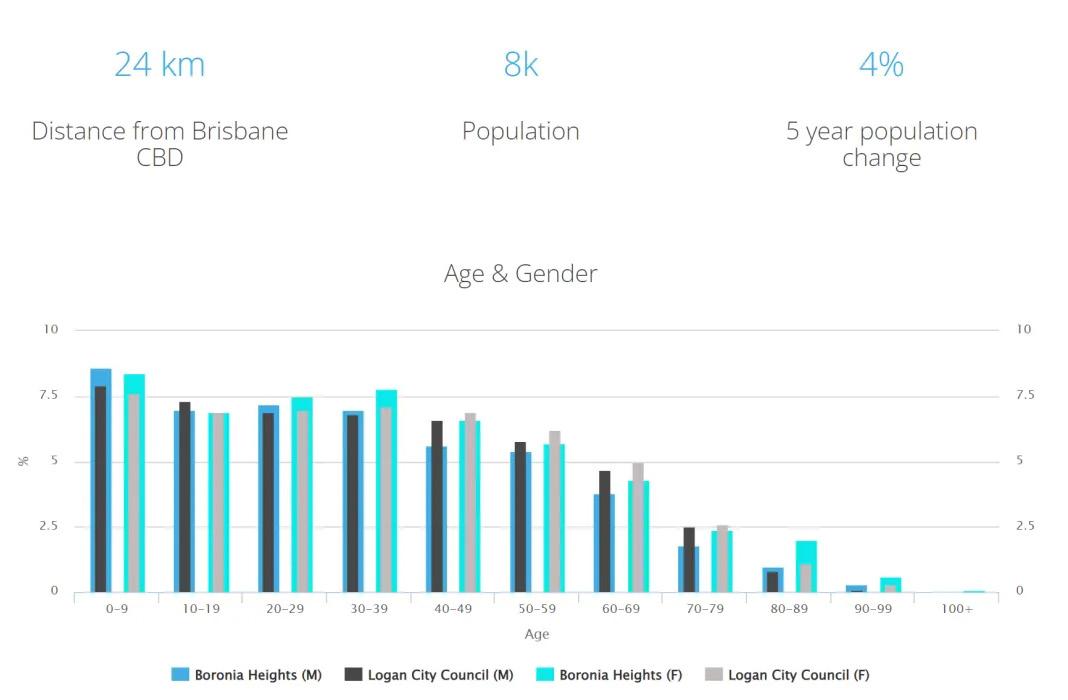 Boronia Heights的面积约为 4.3 平方公里。2011年,Boronia Heights的人口为 7,604 人。到2016年,人口为 7874。在此期间,该地区的人口增加3.6%。Boronia Heights的主要年龄组是0-9岁。Boronia Heights的家庭主 要是无子女的夫妇,每月 要偿还1400 至1799 澳元的抵押贷款。一般来说,Boronia Heights的人从事贸易职 业。2011年,Boronia Heights59.9%的房屋是自住的,而2016年为 58.1%。(资料来源:澳大利亚统计局)
