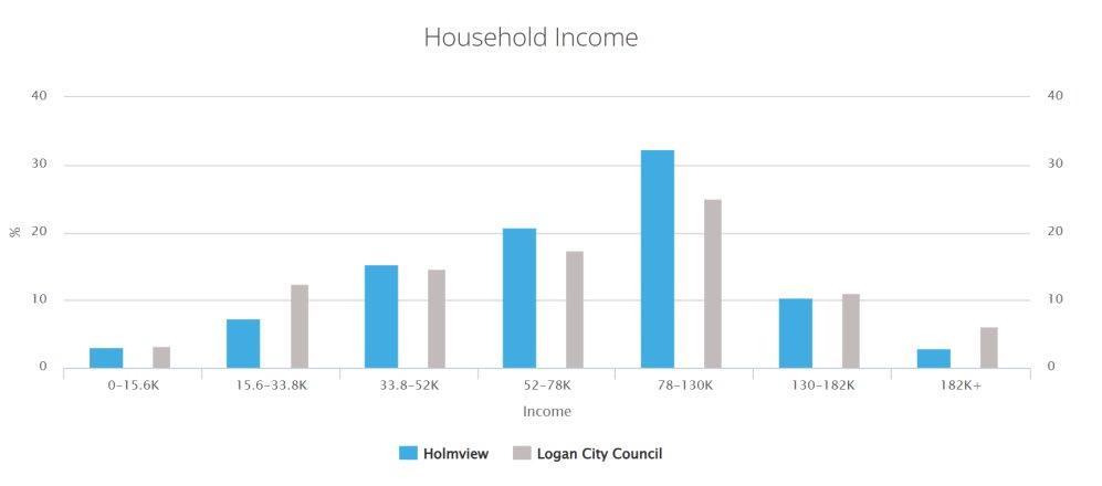 Holmview的面积约为 4 平方公里。2011年,Holmview 的人口为 1,395 人。到2016年,人口为 2,351 。 在此期间,该地区的人口增加 68.5%。Holmview的主要年龄组是20-29 岁。Holmview的家庭主要是有孩 子的夫妇,每月 要偿还 1400 至 1799 澳元的抵押贷款。一般来说,Holmview的人从事贸易职业。2011 年,Holmview47.4%的房屋是自住的,而2016年为 47.6%。(资料来源:澳大利亚统计局)