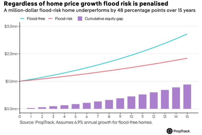 风险的房屋数量增长差距更大,在某些情况下,与 没有洪水风险的房屋相比,表现差了多达 48 个百 分点。在 15 年的时间里,对于价值 100 万澳元 的房产来说,这可能意味着将近 90 万澳元的资产 增值损失。