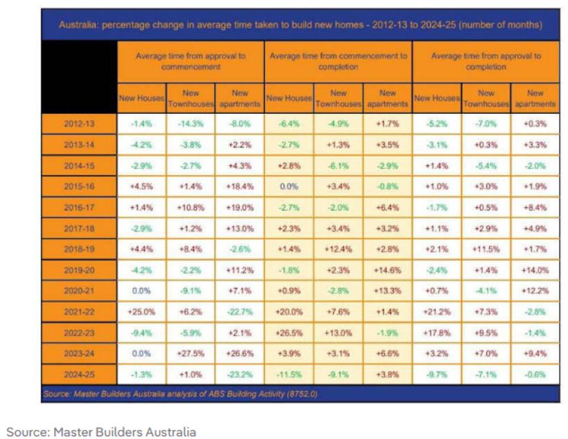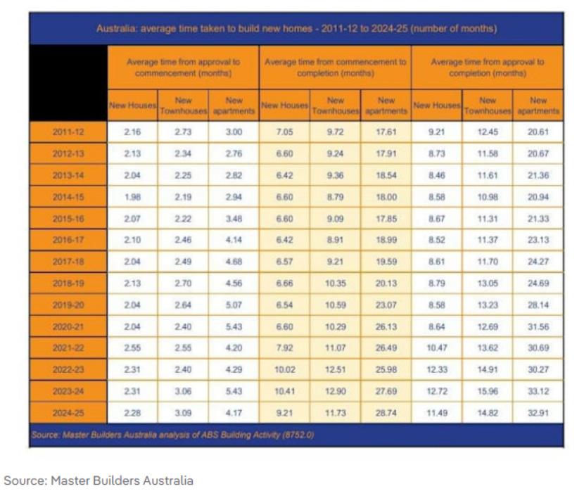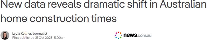 公寓楼的建设周期向来最长,但在 2024 至 2025 年期间已缩短至 32.9 个月,而独立式住宅从获批 到竣工的间隔时间则缩短至 11.5 个月。澳大利亚 建筑大师协会首席经济学家Shane Garrett表示: “这是由于供应链压力持续缓解以及劳动力短缺情