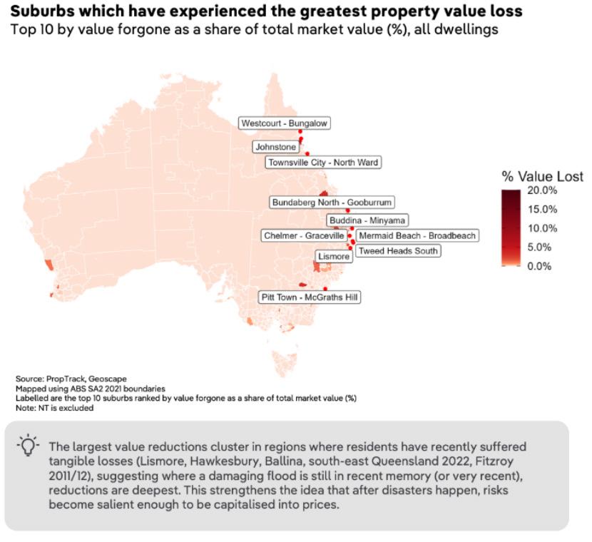 PropTrack 的最新研究首次从全国范围、基于数 据的角度展示了洪水风险如何已反映在澳大利亚房 地产市场的价格中,分析了洪水风险对单个住宅物 业价值的影响。这些数据并非基于任何未来预测或 气候变化模型,而是基于当前已知的洪水风险对洪 水易发区房产价值的实际市场影响,以及这种洪水 风险在不同地区当下的定价情况。