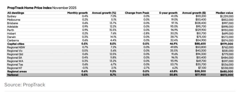 最新的“PropTrack Home Price Index”显示, 11月份全国房屋均价上涨了0.5%,与一年前相 比已上涨了8.7%。自年初以来,房价一直在稳步 上涨。澳大利亚储备银行的三次降息提高了借贷能 力,并降低了房贷还款成本。