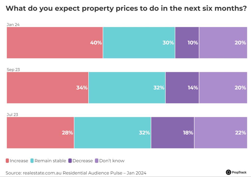 realestate.com.au 的最新数据显示,买家情绪 略有变化,价格上涨和对未来加息的担忧是首要 考虑因素。尽管如此,仍有相当多的受访者认为 现在是购买的好时机,表现出担忧和乐观的混合。