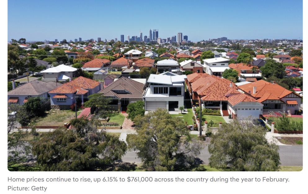 近年来房价上涨和抵押贷款利率的急剧上升导致 负担能力下降,而存款储蓄时间表已经过长。该 报告发现,一个平均收入的家庭需要将收入的 20%储蓄超过五年半,才能在中位价房屋上获得 20%的存款。印花税等住房成本是其他复合因素, 购房者的成本是上一代人的六倍,在过去四十年 中,房价已经超过了工资包。根据最新的房价指 数,在截至 2 月的一年中,全国房价上涨 6.15% 至 761,000 澳元。