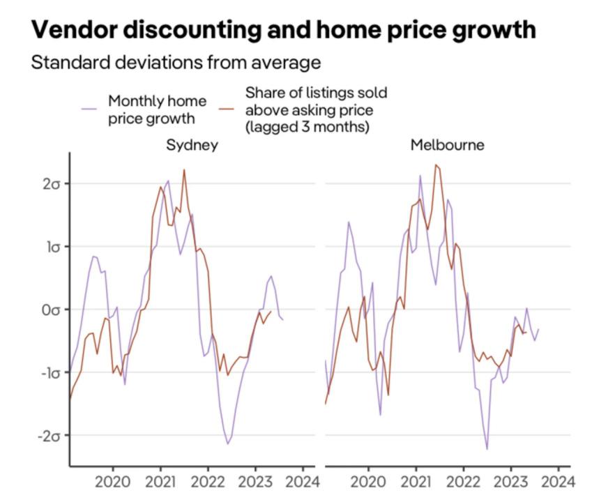 于要价(与供应商折扣相反)的房源份额与最近 的价格增长进行比较,可以看出紧密的关系。在 悉尼和墨尔本这两个最大的市场进行比较时,这 一点很明显。