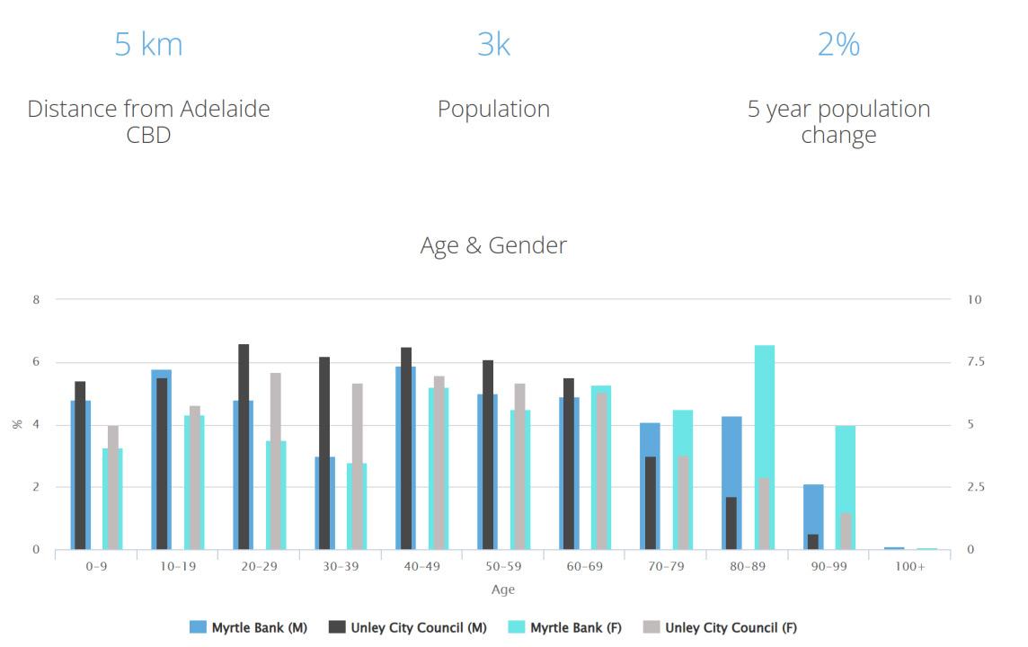 Myrtle Bank的面积约为1.7平方公里。2011年,Myrtle Bank的人口为2,939人。到2016年,人口为2,875 人,在此期间该地区的人口下降率为2.2%。Myrtle Bank的主要年龄组是80-89岁。Myrtle Bank的家庭主 要是有孩子的夫妇,每月可能偿还1800至2399澳元的抵押贷款。一般来说,Myrtle Bank的人从事专业职 业。2011年,Myrtle Bank有66% 的房屋是自住房屋,而2016年为69.9%。(资料来源:澳大利亚统计局)