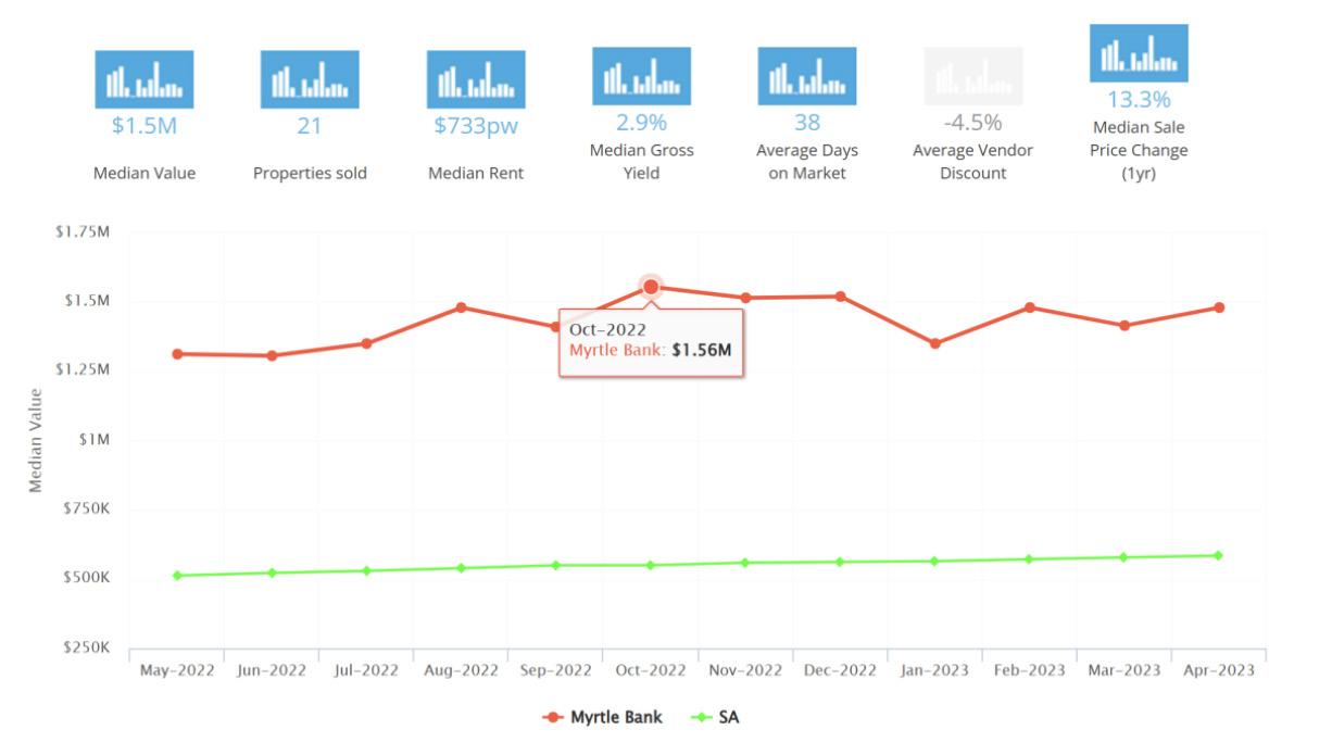 Hyde Park 和 Unley Park 的中位数价格均超过 $2.5m,分别从 12 和 17 的销售额中位数上涨 了 $2.7375m 和 $2.55m。Fitzroy ($2.26m)、 Springfield($2.25m)、St Peters($2.45m)、 Tennyson ($2.235m)、Leabrook ($2.2m)