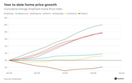 到目前为止,房地产价格超出了预期。最新的 PropTrack房价指数显示,许多市场已经完全恢 复了去年的快速下跌,现在正处于新的上涨之中。