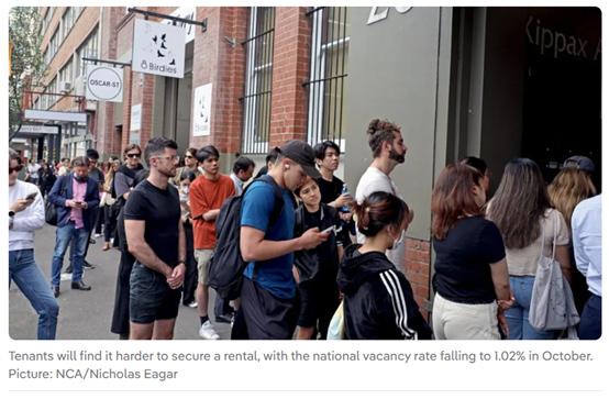 最新的PropTrack数据发现,10月份全国租赁空 置率降至创纪录的1.02%,环比下降0.06个百分 点。由于住房建设跟不上海外移民涌入澳大利亚的 速度,澳大利亚的租金危机进一步加剧。对于租房 者来说,这是又一次打击,他们在生活成本危机中