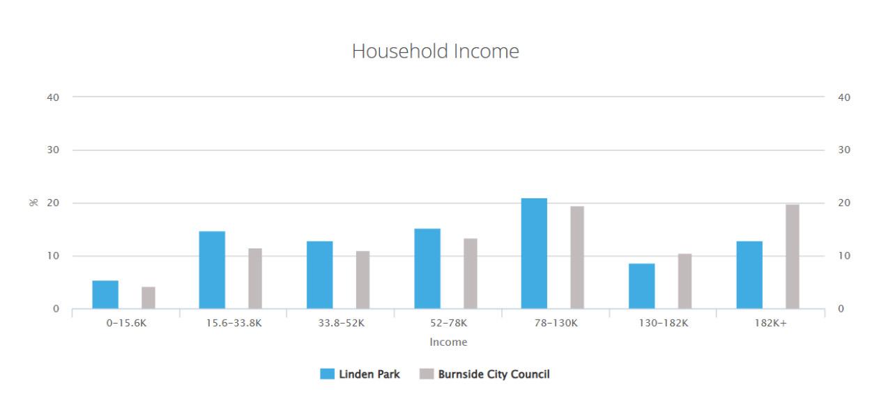 Linden Park的大小约为0.8平方公里。2011年Linden Park的人口为1887人。到2016年,人口为2007人,在 此期间该地区的人口增长率为6.4%。Linden Park的主要年龄组是10-19岁。Linden Park的家庭主要是有 子女的夫妇,每月可能偿还1800-2399澳元的抵押贷款还款。一般来说,Linden Park的居民从事专业职 业。2011年,Linden Park 75%的房屋是自有住房,而2016年为74.5%。(资料来源:澳大利亚统计局)
