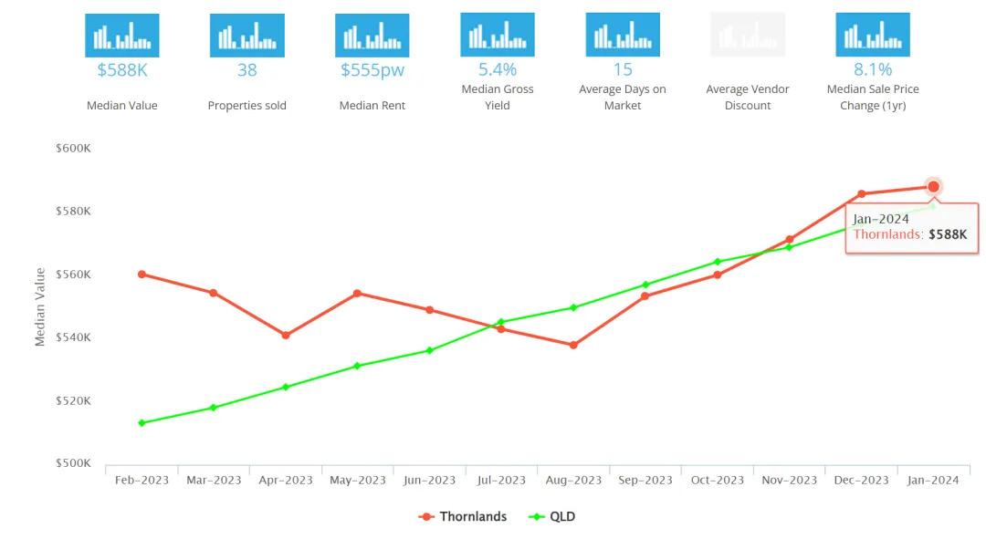在过去的12个月里,Thornlands已经卖出了38套单元房,售价中位数为$588K,同比增长8.1%,平均需要 15天即可售出。