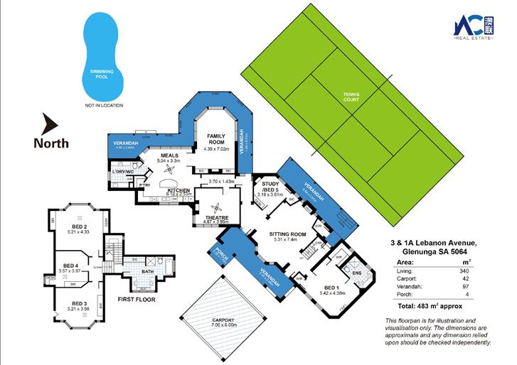 主屋三面环绕的开放或遮顶式 verandah,为室 内外生活提供了良好过渡。后花园中,维护良好 的 Supergrasse 网球场、位置稍隐却适合全年使 用的泳池,以及配备天幕的 Gazebo 娱乐区,构 成了一个四季皆宜的多功能庭院天地,无论是娱 乐、社交还是静享时光都十分合适。