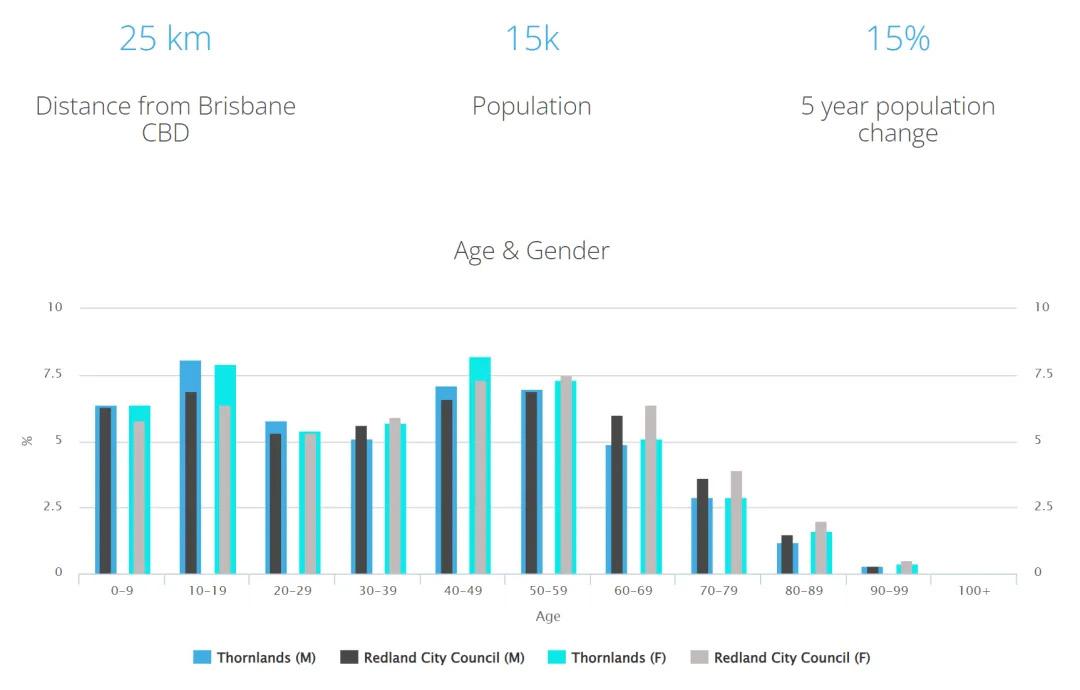 Thornlands的面积约为21.7平方公里。2011年,Thornlands的人口为 12,806 人。到2016年,人口为 14,696。 在此期间,该地区的人口增长了 14.8%。Thornlands的主要年龄组是10-19岁。Thornlands的家庭主要是有孩 子的夫妇,可能每月偿还 1800 至 2399 澳元的抵押贷款。一般来说,Thornlands的人从事专门职业。2011 年,Thornlands 76.6%的房屋是自住的,而2016年为73.6%。(资料来源:澳大利亚统计局)
