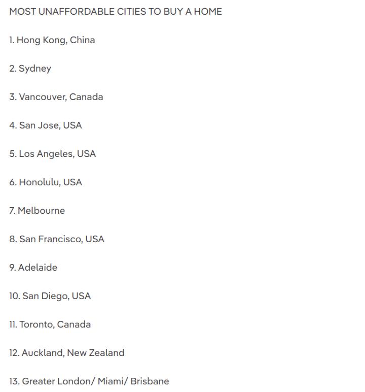 澳大利亚三个首府城市跻身全球十大最难以负担 的城市之列。一年一度的Demographia报告将 悉尼列为全球第二大最难买房的城市,这是这座 海港城16年来第15次跻身全球前三。