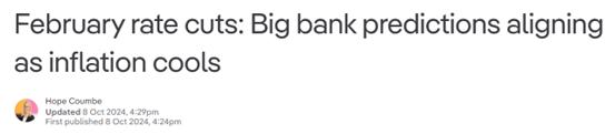 近几个月来,NAB一直是四大银行中的异类, 保守地认为明年5月是澳大利亚央行最有可能降 息的时间。然而,在上周确认总体通胀率已降至 2021年8月以来的最低水平之后,该行本周修 正了现金利率预测。
