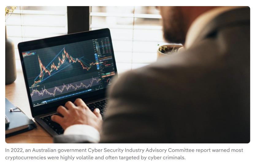 2022 年,澳大利亚政府网络安全行业咨询委员会 的一份报告警告说,大多数加密货币都高度波动, 并且经常成为网络犯罪分子的目标。