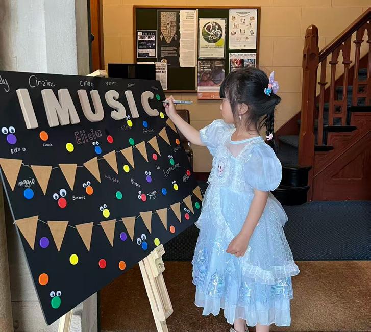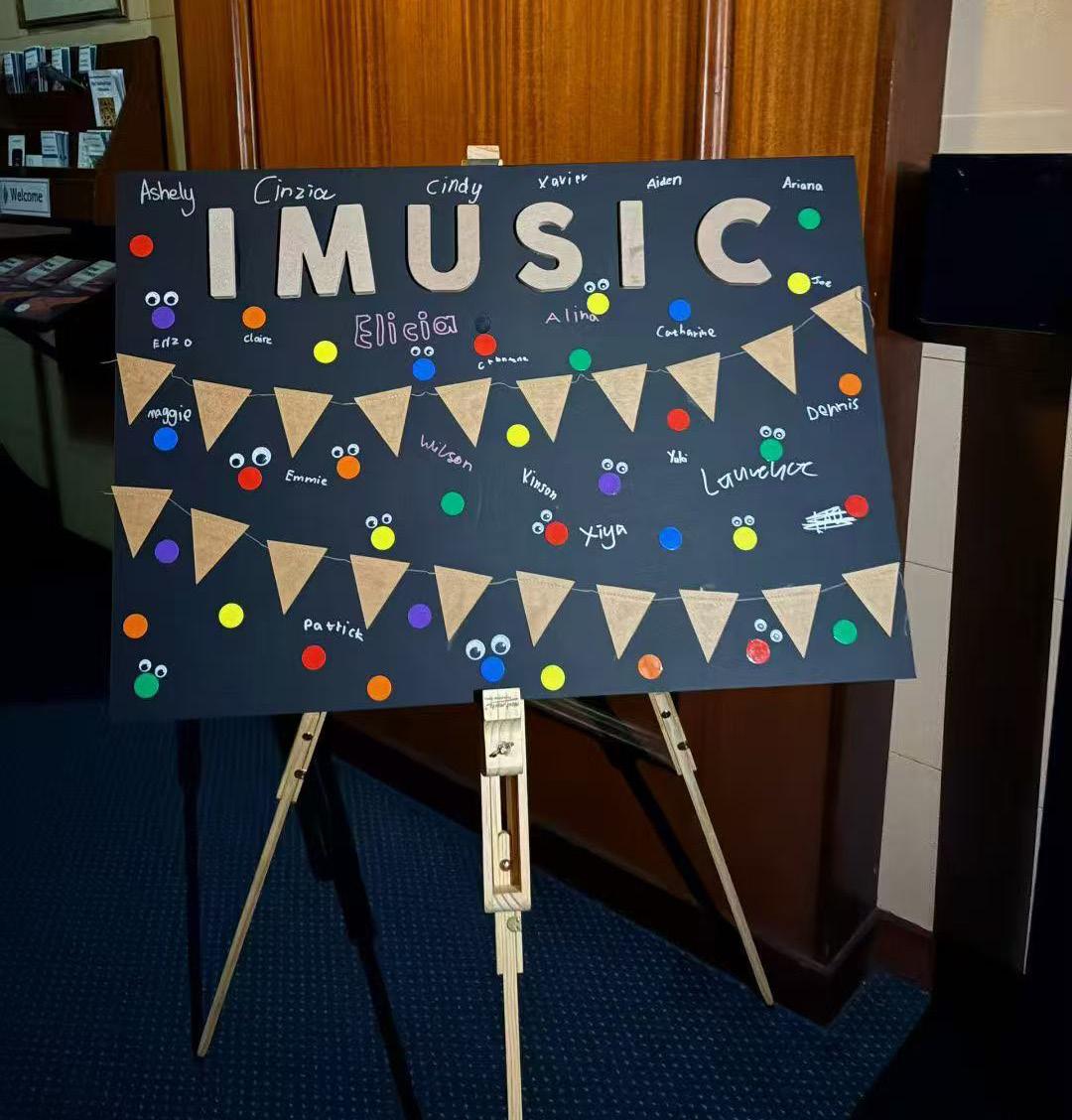 今年的签到环节充满了温情与小小的惊喜。细心的 家长和孩子们会发现,那块精心布置的签到板,竟 是去年十月音乐会结束后,由 MINA 老师亲手制 作留存的。这份跨越了一年的“礼物”,仿佛一个 时间的信物,无声地诉说着成长的足迹。孩子们在 寻找自己名字的过程中,或许会回想起去年的懵懂 与紧张,从而更添一份对当下的珍惜与从容。由于 一些演出的学生因时间冲突未能亲手完成签到,老