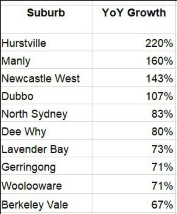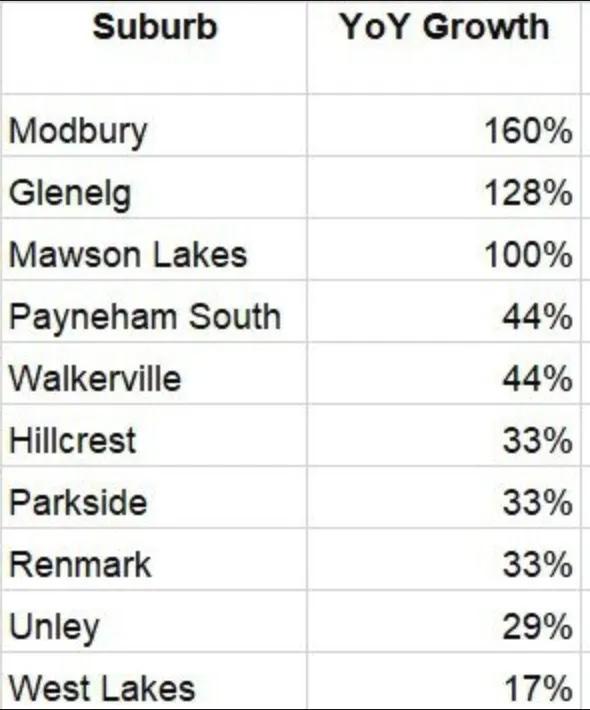 这种增长态势遍布全澳:阿德莱德的Modbury 增长160%,达尔文增长171%,霍巴特的Park Grove增长71%。