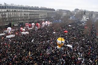 Más de dos millones personas, según los sindicatos. Masiva jornada de protesta contra la reforma jubilatoria de Macron. En ciudades pequeñas, medianas o grandes, incluida París, cientos de miles de manifestantes acudieron a una convocatoria que no serála última.Lascentrales sindicalesllamana una nueva huelga el 31 de enero. Por Eduardo Febbro. Desde París. No importa cuál sea la cifra, si la oficial o la de los sindicatos, lo cierto es que los 8 sindicatos franceses que convocaron este 19 de enero a una huelga y a una manifestación contra el aumento de la edad mínima para jubilarse (64 años contra los 62 actuales), consiguieron su propósito más allá de lo esperado. Las más de 200 manifestaciones que se llevaron a cabo en todo el país reunieron, según la policía, a 1,2 millones de personas mientras que el Secretario general de la CGT, Philippe Martínez, habló de “más de dos millones de personas”. En París, horas antes de la manifestación prevista en la Plaza de la República, ya se veía que iba a ser un día histórico: pacíficamente, cientos
