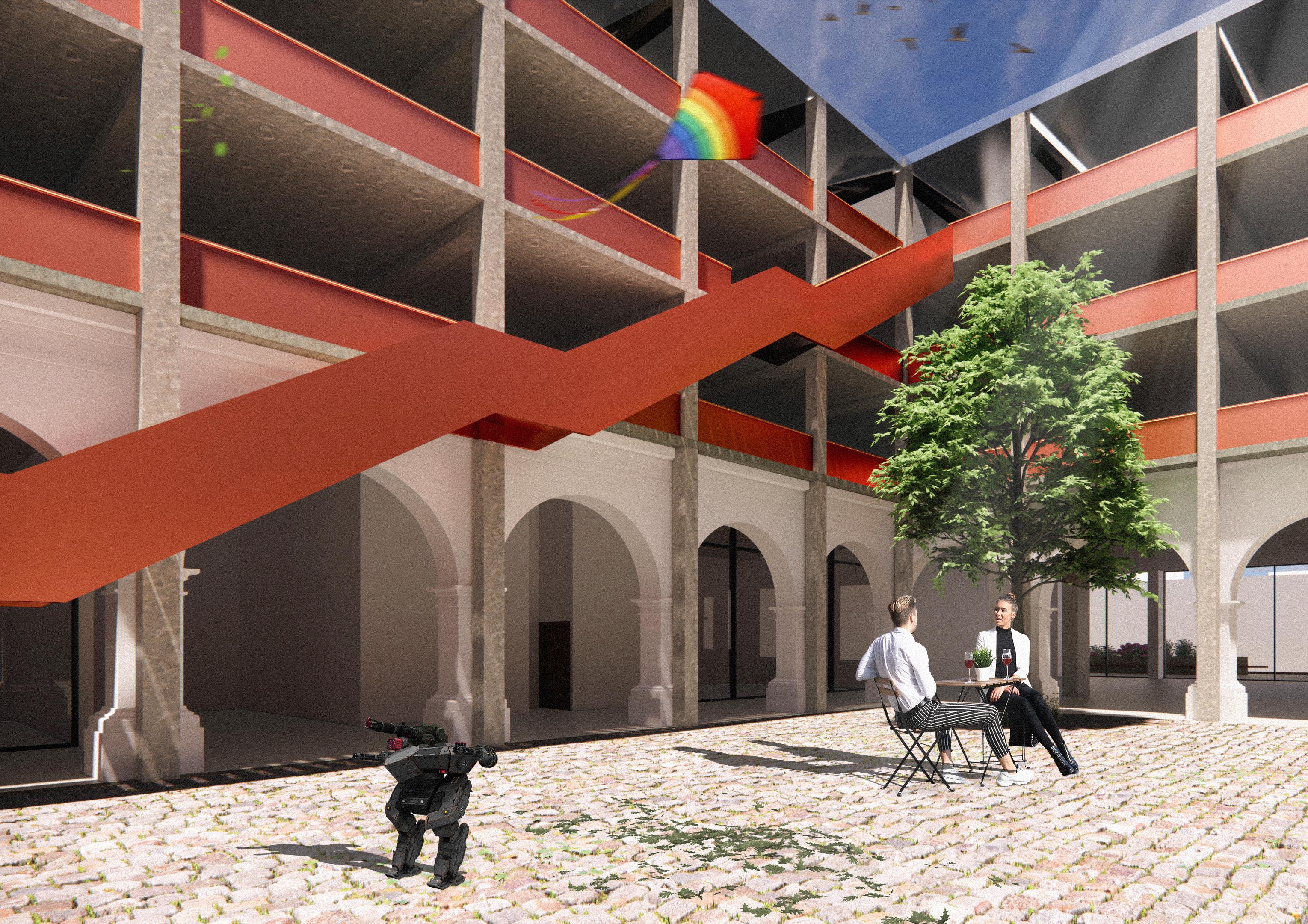 La estructura de adapta al claustro, lo cual permite la conservación de la plaza central sin afectar la arcada pre - existente.