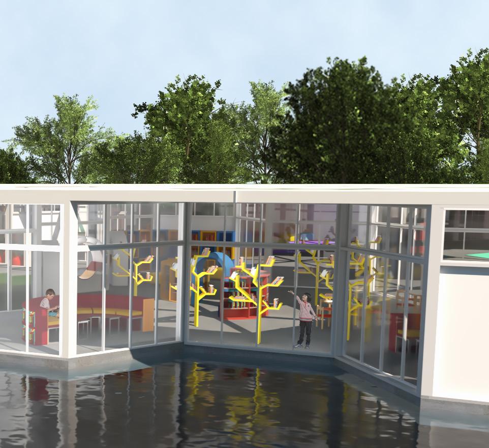 Localizada no Butantã, a escola foi projetada buscando sempre voltar-se à criança, partindo de sua escala como norte para as decisões tomadas. Tem-se como partido a modulação hexagonal, fazendo uso de módulos de 3 metros de lado, que compõem os espaços do programa; a horizontalidade por meio da distribuição dos módulos em um único nível, devido às grandes dimensões do terreno; a transparência, a fim de gerar transições sutis entre interno-externo, permitindo a conexão com o projeto do parque fluvial proposto pela disciplina; a integração com a natureza (o parque fluvial e no próprio terreno), utilizando-a como um método de aprendizado e fazendo dela parte do ambiente projetado; e a metodologia montessoriana com ambientes temáticos e lúdicos que geram autonomia para as crianças e estimulam o seu desenvolvimento.